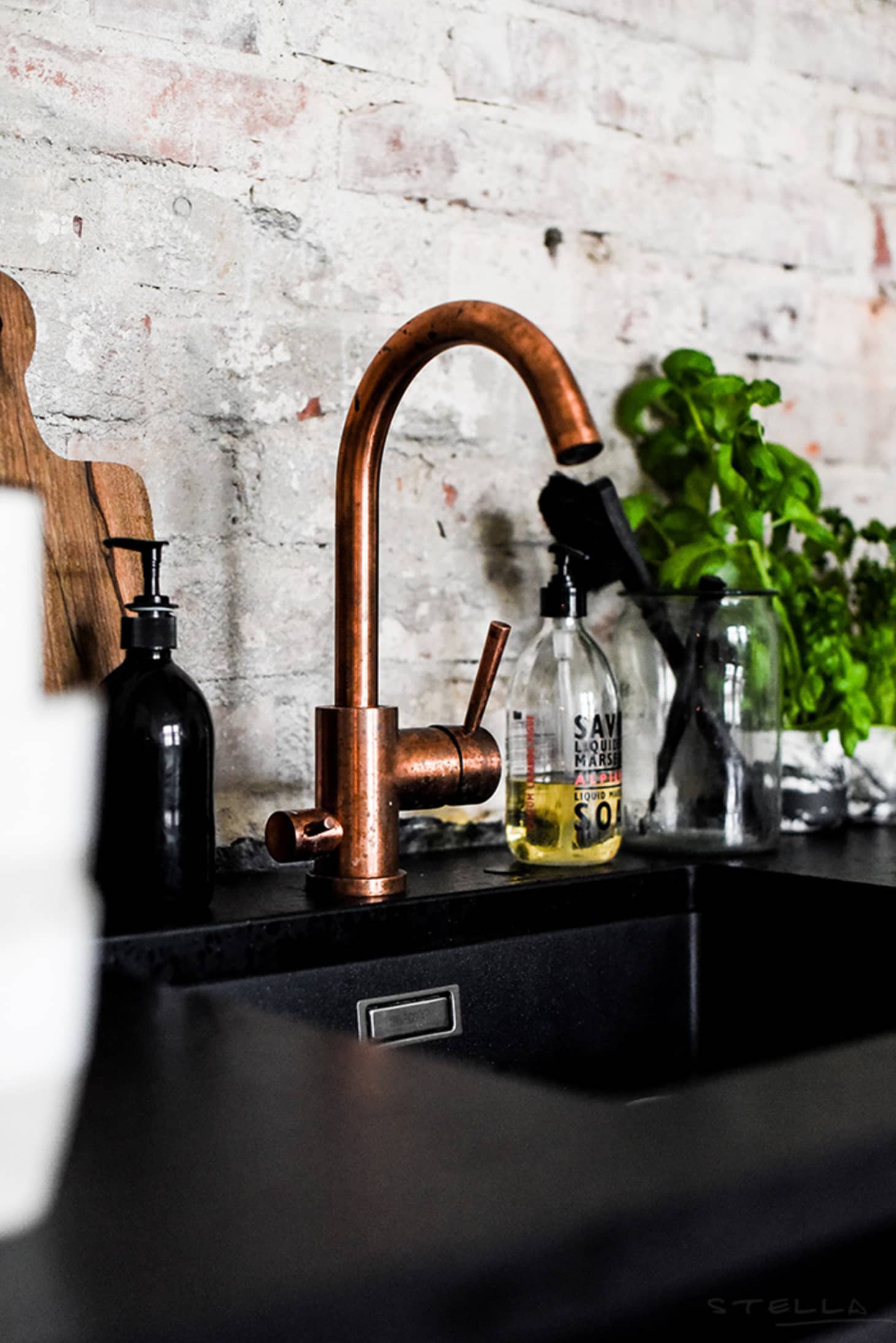 Brass Gooseneck Faucet And Farmhouse Sink Under Black Kitchen